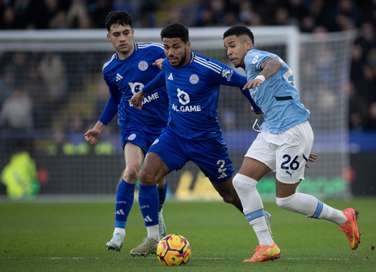LEICESTER, ENGLAND – DECEMBER 29: Savinho of Manchester City is challenged by James Justin and Facundo Buonanotte of Leicester City during the Premier League match between Leicester City FC and Manchester City FC at The King Power Stadium on December 29, 2024 in Leicester, England. (Photo by Joe Prior/Visionhaus via Getty Images)