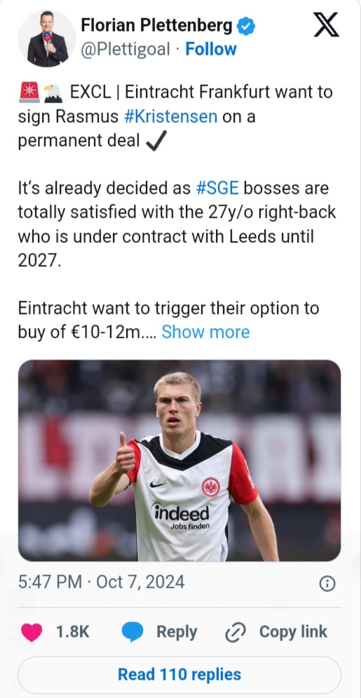 According to Sky Sports journalist Florian Plettenberg, Eintracht are thrilled with Kristensen’s performances since his loan move, to the extent that they are considering activating their purchase option.