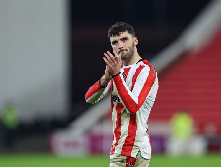 STOKE ON TRENT, ENGLAND – NOVEMBER 26: Stoke City’s Tom Cannon applauds the Preston North End fans at the final whistle during the Sky Bet Championship match between Stoke City FC and Preston North End FC at Bet365 Stadium on November 26, 2024 in Stoke on Trent, England.