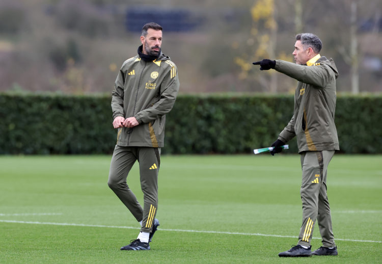 LEICESTER, ENGLAND – DECEMBER 02 : Leicester City Manager Ruud van Nistelrooy speaks with Leicester City first team set piece coach Andrew Hughes during the Leicester City Training Session at Seagrave Training Complex on December 02, 2024 in Leicester, England.
