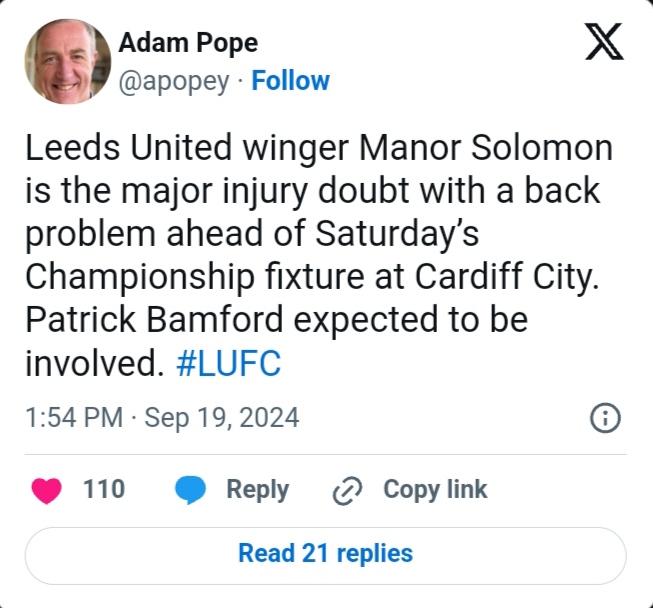According to Adam Pope, Manor Solomon is the key injury concern for Leeds United ahead of the Championship clash against Cardiff on September 21.