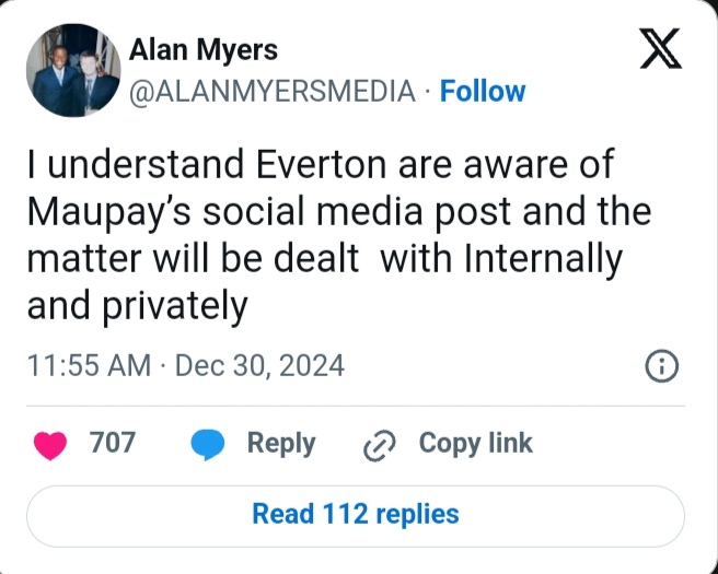 Writing on his personal X account on 30 December, Myers stated: “I understand Everton are aware of Maupay’s social media post, and the matter will be dealt with internally and privately.”