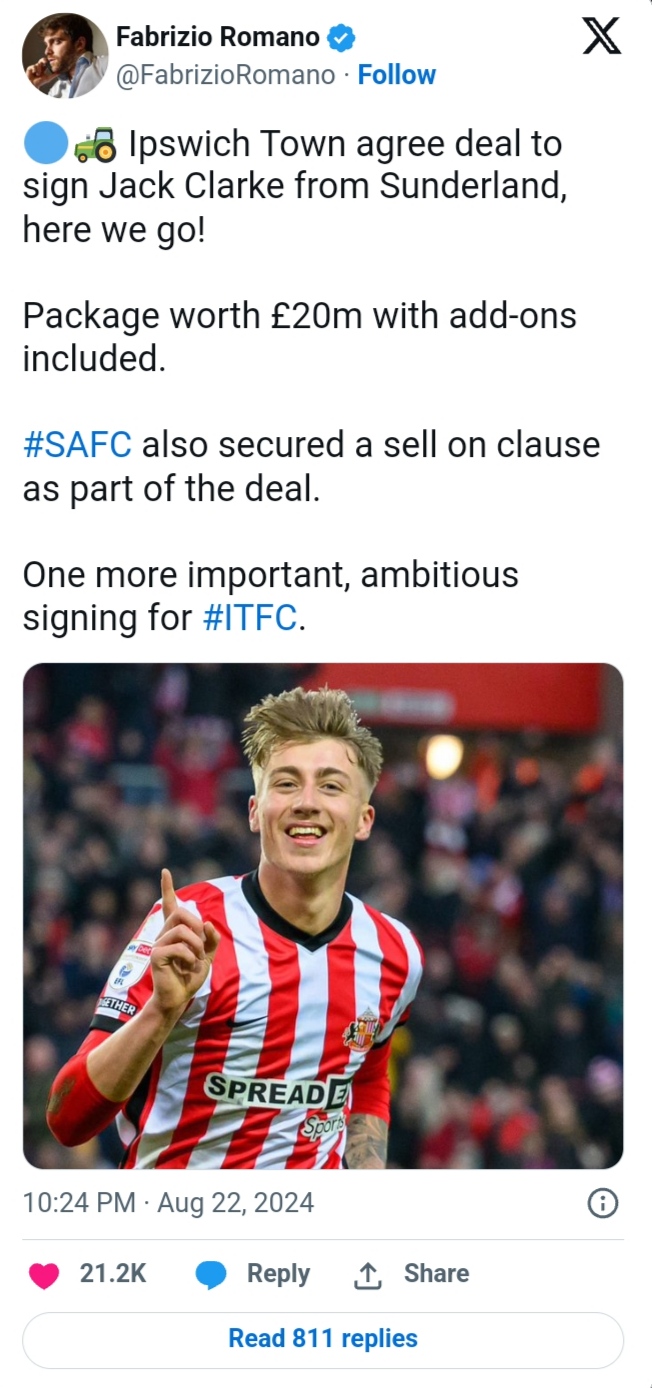 Fabrizio Romano has confirmed that Clarke’s transfer to Ipswich is imminent, with the deal expected to be around £20 million.
