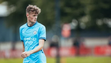 The striker scored twice, netting a goal on either side of half-time, to secure City’s Under-18s their first league victory…