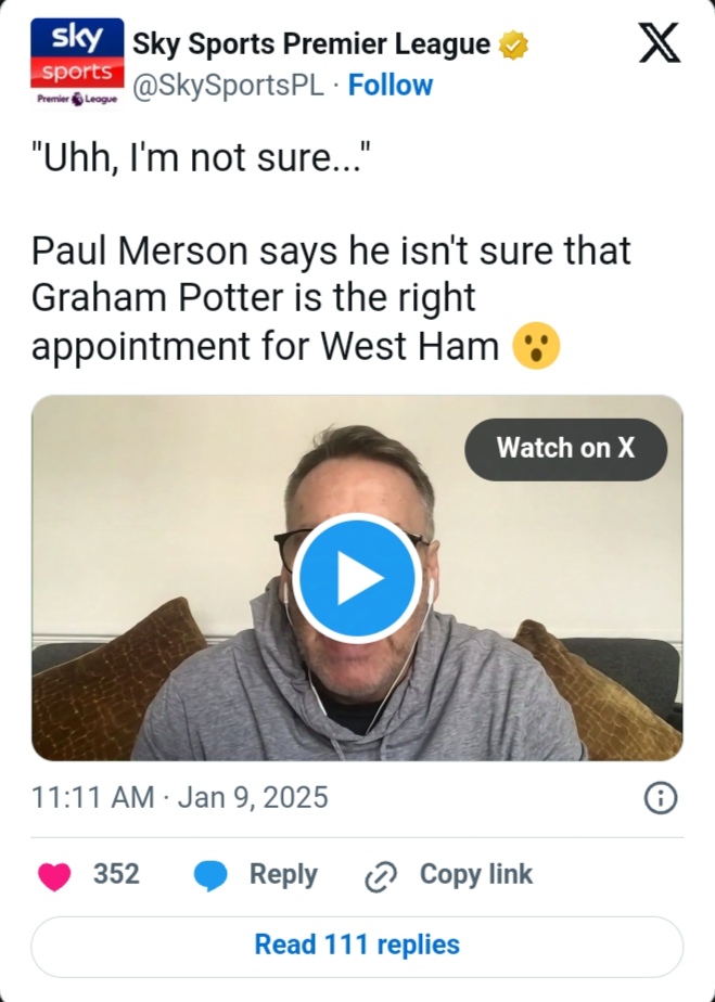 Speaking on Sky Sports News on 9 January, Merson questioned whether West Ham is the right fit for Potter, saying, “I’m not sure.