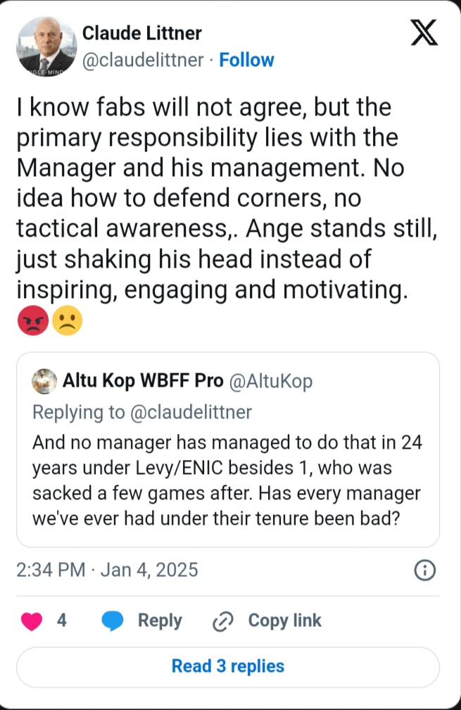 Littner, who served as CEO during the Alan Sugar era, has expressed a lack of confidence in Postecoglou’s ability to turn the situation around.