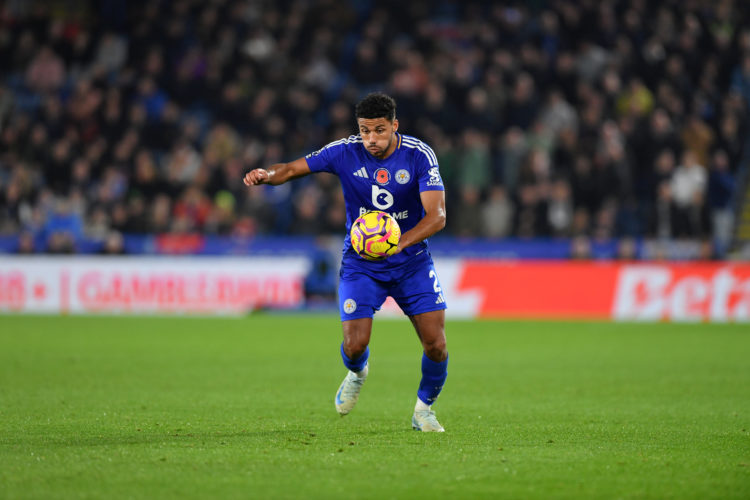 LEICESTER, ENGLAND – OCTOBER 25: James Justin of Leicester City during the Premier League match between Leicester City and Nottingham Forest at King Power Stadium on October 25, 2024 in Leicester, United Kingdom.