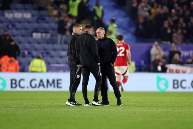 LEICESTER, ENGLAND – OCTOBER 25: Leicester City Manager Steve Cooper, Leicester City goalkeeping coach Danny Alcock and Leicester City first team coach Ben Dawson after the Premier League match between Leicester City and Nottingham Forest at King Power Stadium on October 25, 2024 in Leicester, United Kingdom.