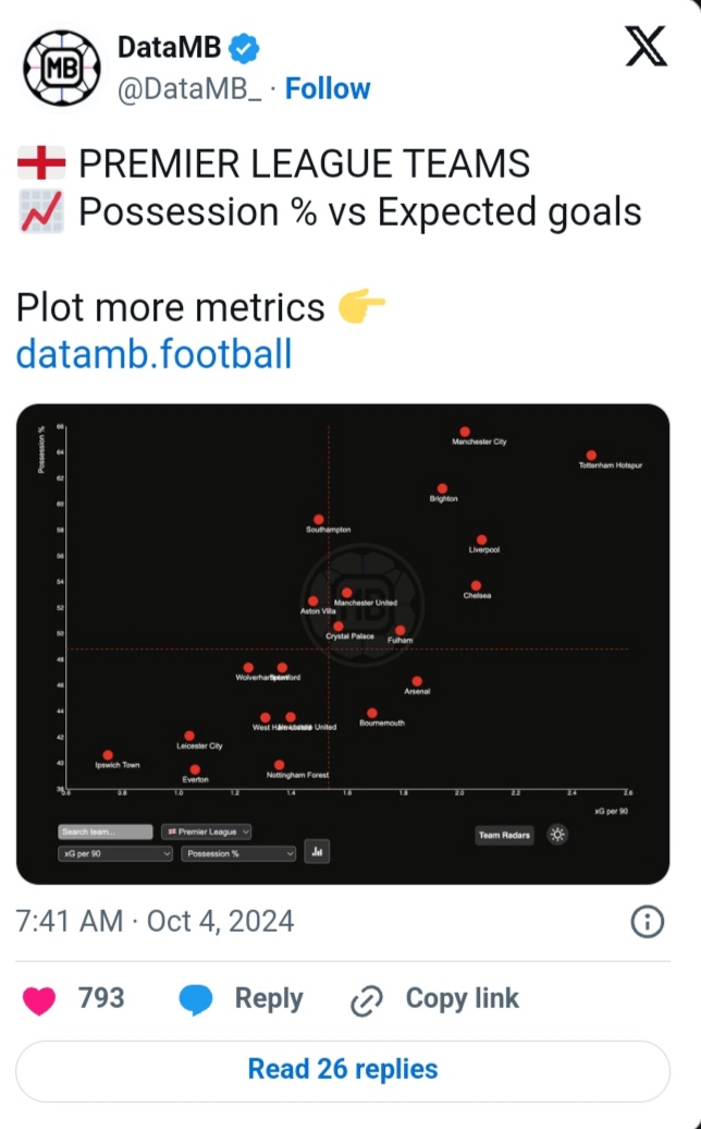 According to DataMB, Spurs boast the second-highest possession in the league, trailing only Manchester City, while also leading in expected goals (xG) by a significant margin.
