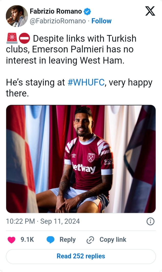 “Despite links with Turkish clubs, Emerson Palmieri has no interest in leaving West Ham. He’s staying at #WHUFC, very happy there.”