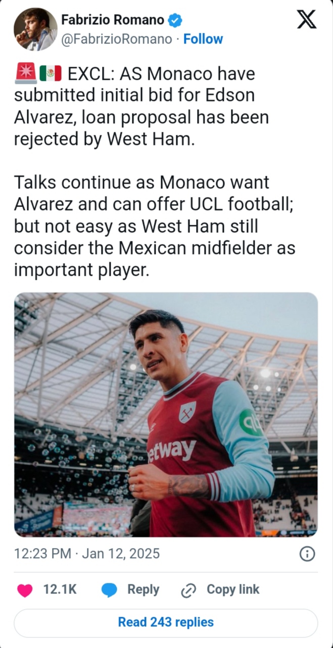 Fabrizio Romano reported, “AS Monaco have submitted an initial bid for Edson Alvarez, a loan proposal that has been rejected by West Ham.