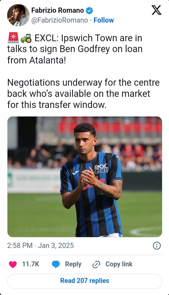 Is Sean Dyche regretting the decision to let Godfrey go? According to Fabrizio Romano [3 January], Ipswich Town is negotiating a loan deal for the 26-year-old.