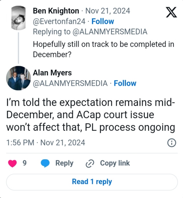 Journalist Ben Myers stated via X: “I’m told the expectation remains mid-December, and ACap court issue won’t affect that, PL process ongoing.”