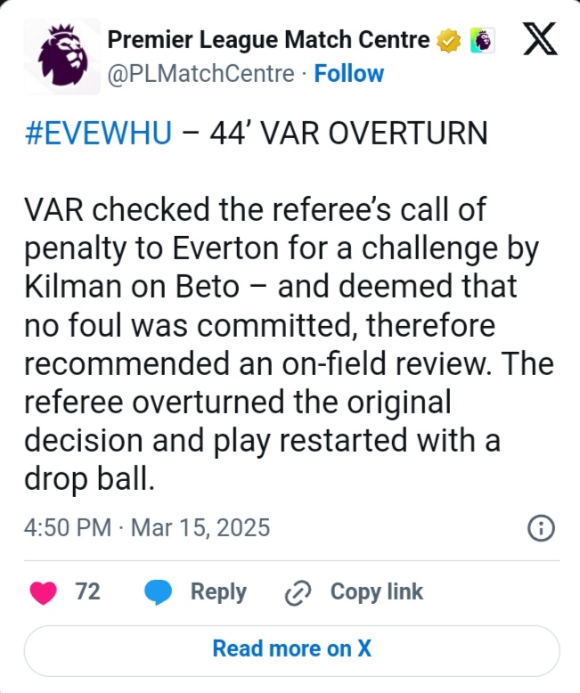 “VAR checked the referee’s call of a penalty to Everton for a challenge by Kilman on Beto – and deemed that no foul was committed, therefore recommended an on-field review.