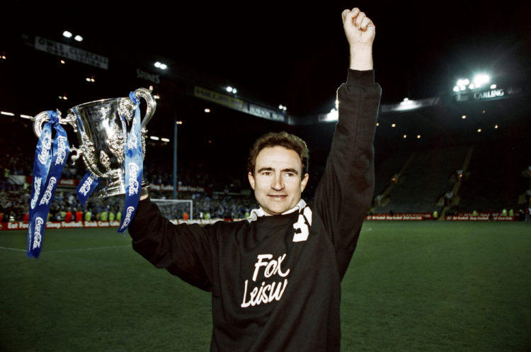 1997 League Cup Final replay at Hillsborough. Leicester City 1 v Middlesbrough 0. Leicester manager Martin O’ Neill holding aloft the trophy after the presentation, 16th April 1997.