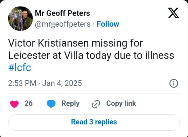 Journalist Geoff Peters clarified the situation, revealing on X that Kristiansen missed the match due to illness. He posted: “Victor Kristiansen missing for Leicester at Villa today due to illness.”