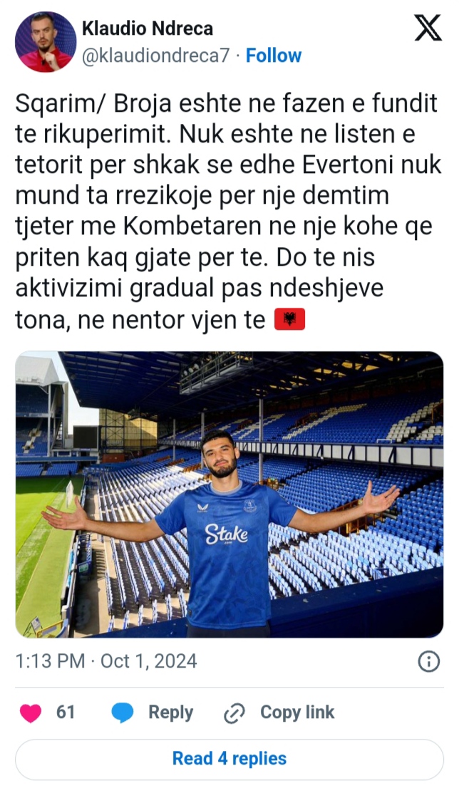 Albanian journalist Ndreca reported on X (1 October) that Armando Broja’s return from a pre-existing injury is imminent, with his Everton debut expected in just over a month.