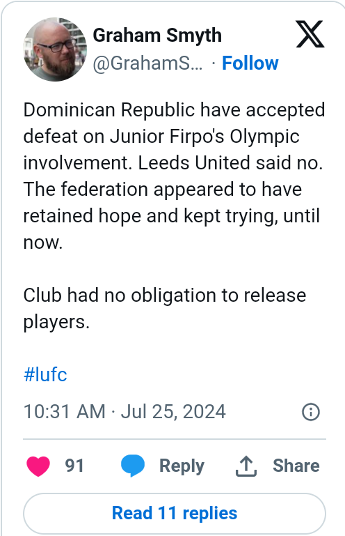 However, it has now been confirmed that Leeds have not granted Firpo permission to participate in the tournament.