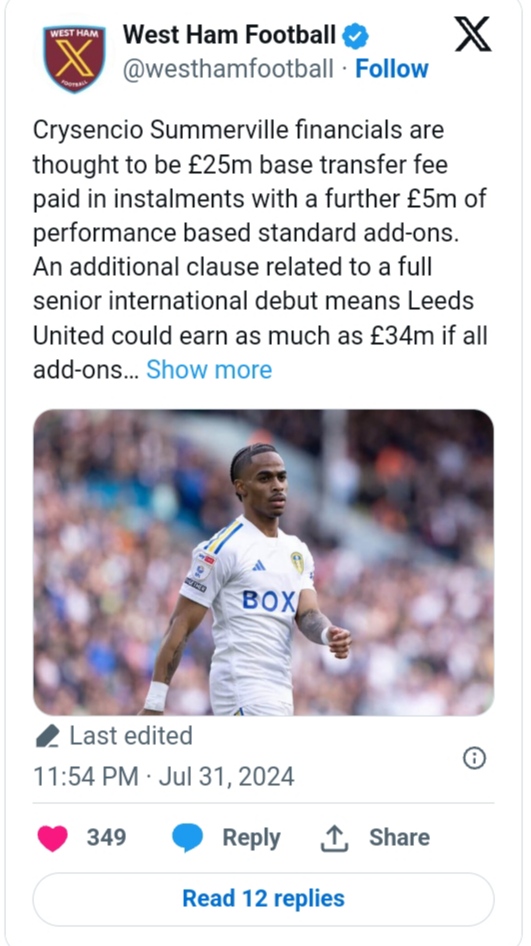 Regarding performance-based add-ons, Summerville’s impact on Julen Lopetegui’s squad could be significant, especially as West Ham aims to return to European competition with an improved squad.