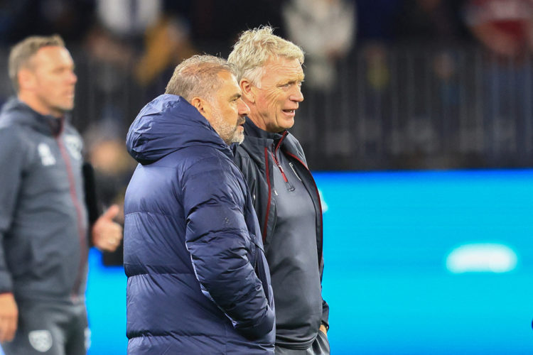 Manager Ange Postecoglou (C) of Tottenham Hotspur talks to counterpart David Moyes (R) of West Ham during an exhibition football match at Optus Stadium in Perth on July 18, 2023.