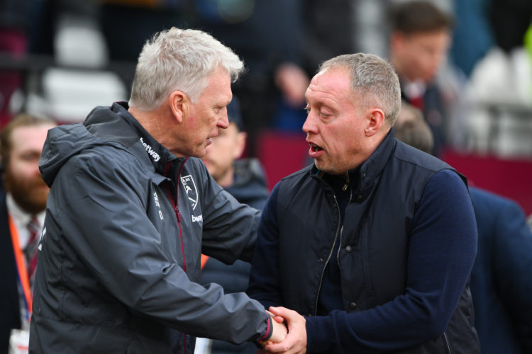 David Moyes, manager of West Ham United greets Steve Cooper, Nottingham Forest head coach during the Premier League match between West Ham United and Nottingham Forest at the London Stadium, Stratford on Sunday 12th November 2023.