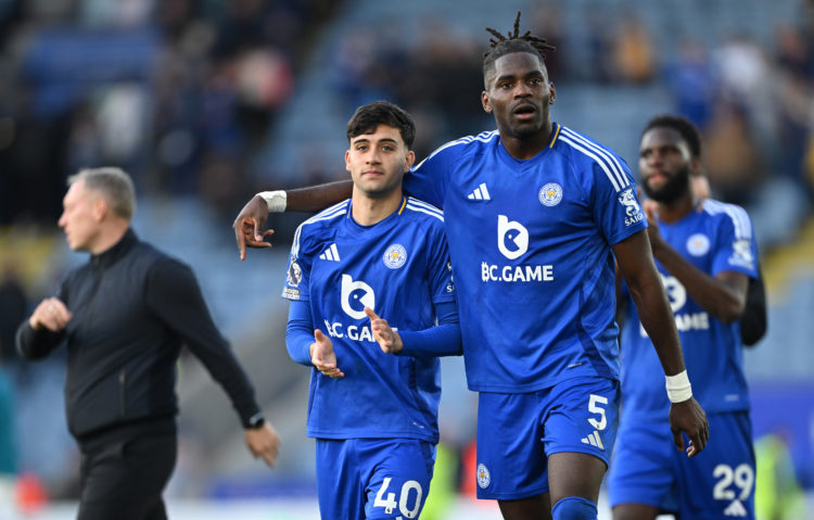 LEICESTER, ENGLAND – OCTOBER 05: Facundo Buonanotte and Caleb Okoli of Leicester City celebrates victory after the Premier League match between Leicester City FC and AFC Bournemouth at The King Power Stadium on October 05, 2024 in Leicester, England.