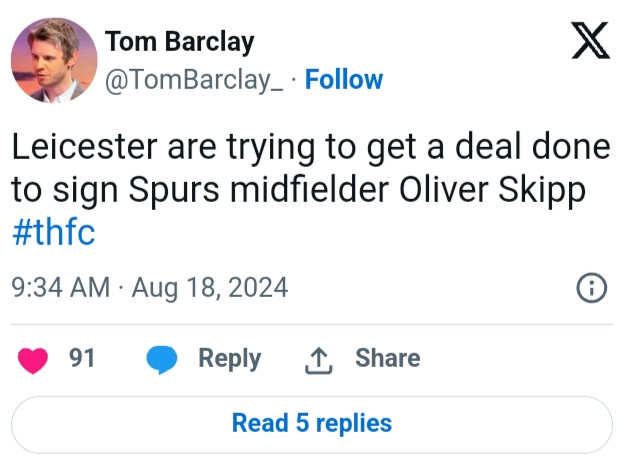 According to journalist Tom Barclay, Leicester is interested in signing Tottenham midfielder Oliver Skipp.