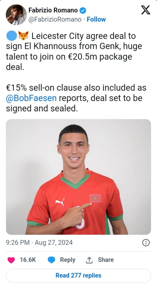However, El Khannouss is now poised to join Leicester City for around £17.2 million, according to transfer expert Fabrizio Romano.