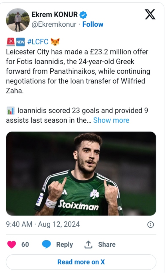 Leicester has reportedly launched a £23.2 million bid for Panathinaikos forward Fotis Ioannidis. Other clubs are also interested in the robust Greece international.