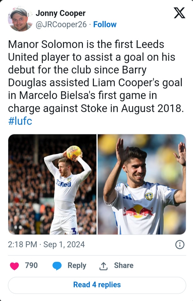 According to Opta’s Jonny Cooper, Solomon has now matched Douglas’ record for debut assists, stating on X: “Manor Solomon is the first Leeds player to assist on debut since Barry Douglas assisted Liam Cooper’s goal in Bielsa’s first game against Stoke in August 2018.”