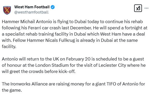 After returning home in December, Antonio flew to Dubai on February 7 to continue his rehabilitation, as reported by West Ham insider Sean Whetstone.