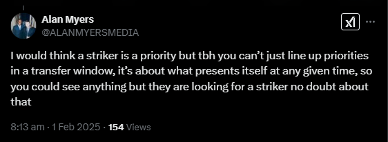 “I would think a striker is a priority, but to be honest, you can’t just line up priorities in a transfer window,” Myers posted on X [1 February].