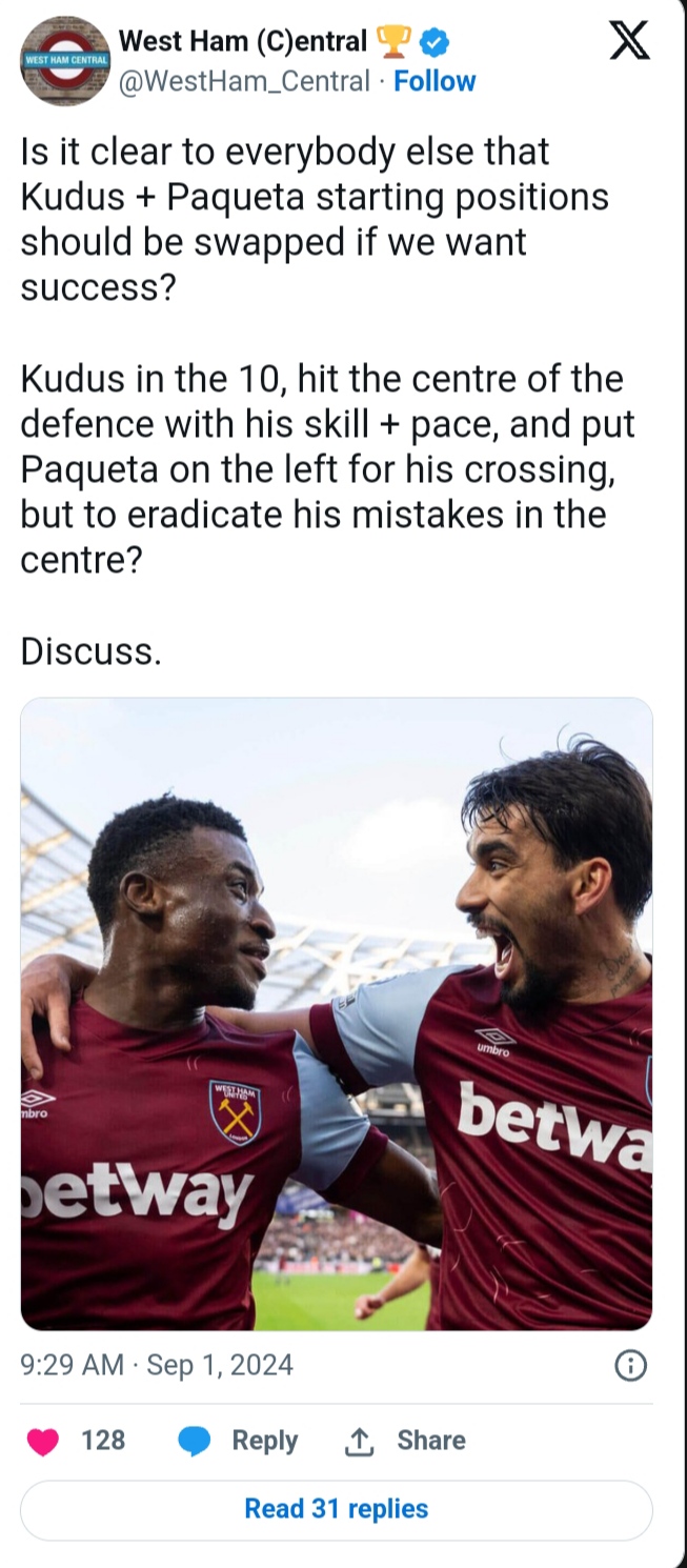 West Ham Central suggested on their X account on September 1 that swapping the positions of Lucas Paqueta and Mohammed Kudus, who both struggled against Man City, could be a crucial tactical adjustment for Lopetegui this season.