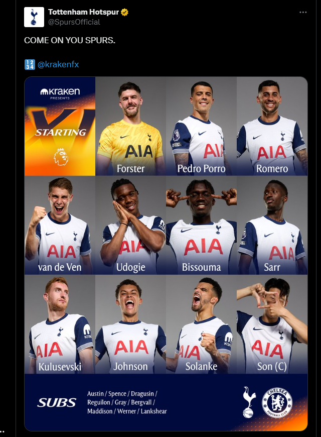 Tottenham confirmed the lineup via their official X account on 8 December, as they prepare to face London rivals Chelsea.