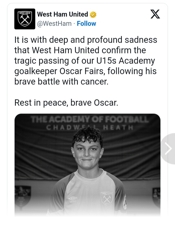 Mark Noble, former West Ham player and sporting director, expressed the club’s grief, saying: “On behalf of everyone at West Ham United, it is with deep and profound sadness that I confirm the tragic passing of our U15s Academy goalkeeper Oscar Fairs, following his brave battle with cancer.