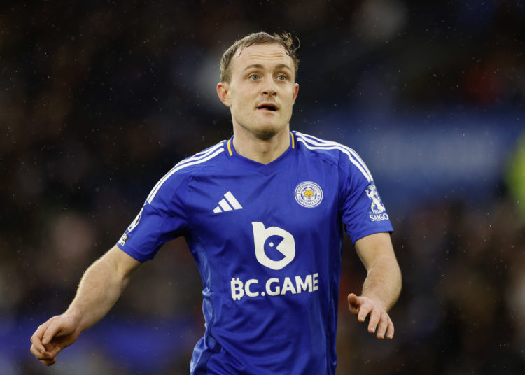 LEICESTER, ENGLAND – NOVEMBER 23: Oliver Skipp of Leicester City looks on during the Premier League match between Leicester City FC and Chelsea FC at The King Power Stadium on November 23, 2024 in Leicester, England.