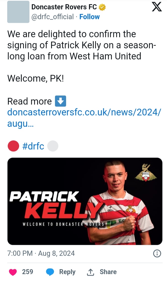 The hope is that Kelly’s loan spell with Doncaster will be successful, allowing him to return to West Ham in a stronger position to challenge for a spot in Lopetegui’s first team, ideally after helping Doncaster Rovers secure promotion to League One.