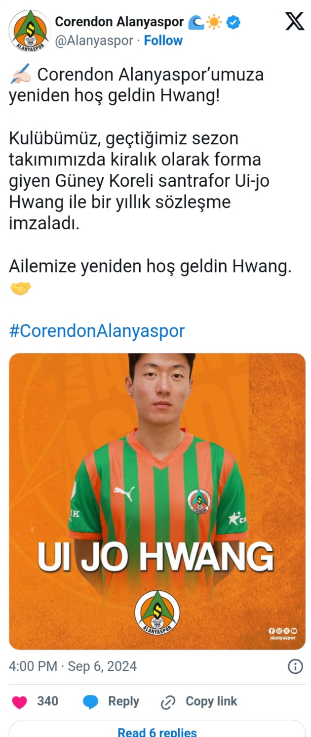 On Friday, it was confirmed that Hwang had permanently departed Forest, signing with Turkish club Alanyaspor.
