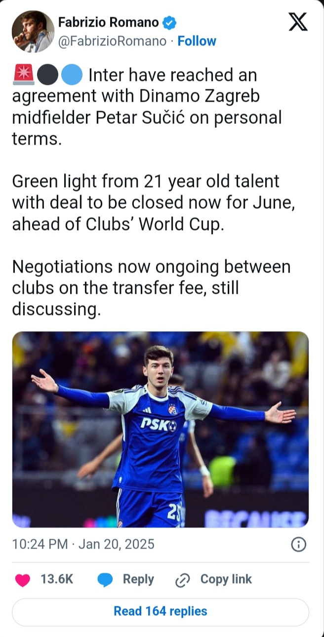 Fabrizio Romano recently reported that Inter and Sucic have reached an agreement, with the deal potentially costing the Serie A giants around £17 million.