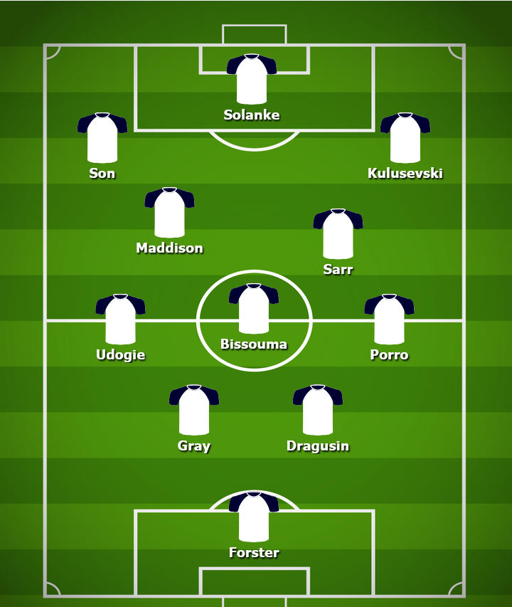 Right-wing: Dejan Kulusevski retains his spot on the right wing, relegating Brennan Johnson to the bench.