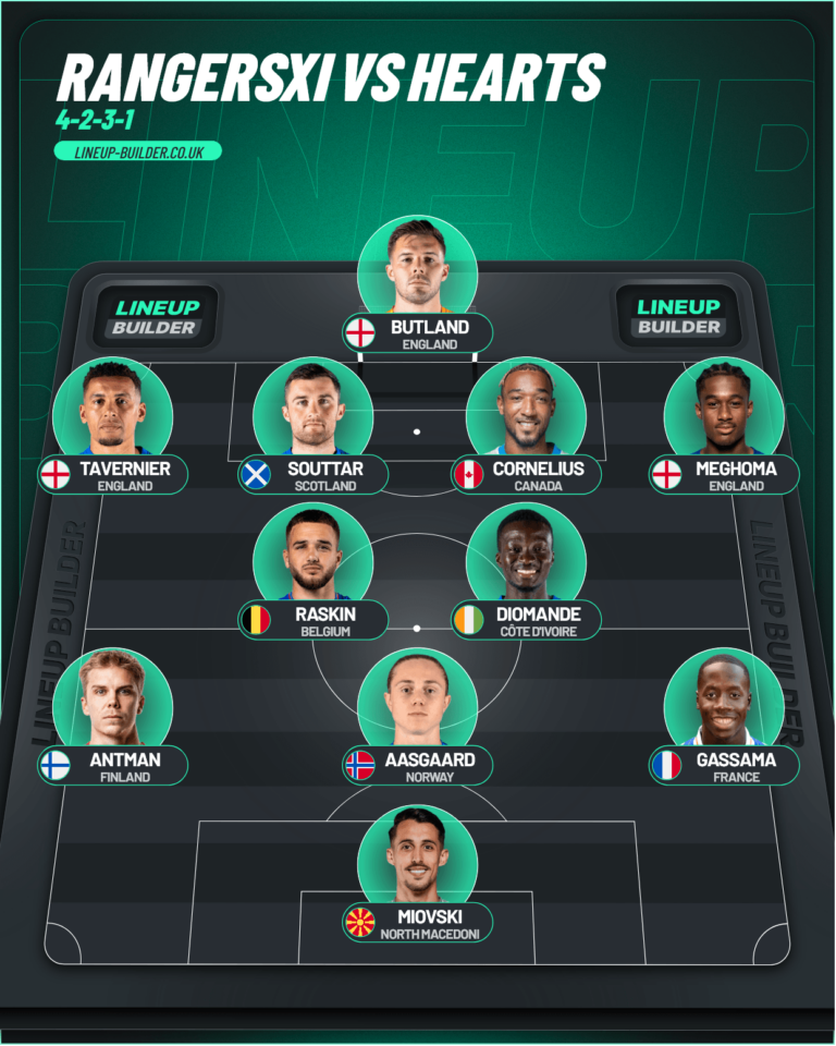 Predicted XI vs Hearts: Butland; Tavernier, Souttar, Cornelius, Meghoma; Raskin, Diomande; Antman, Aasgaard, Gassama; Miovski.