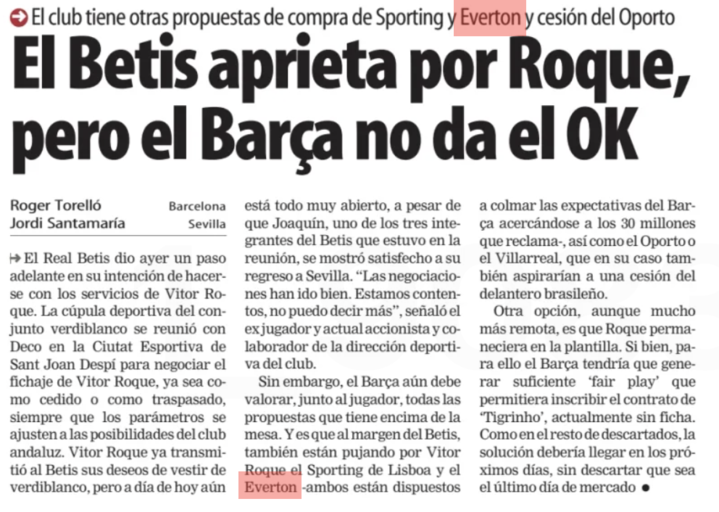 According to a Spanish newspaper report on Wednesday (21 August, page 4), Everton is facing competition from Sporting CP, FC Porto, and Villarreal, all of whom are willing to pay £25.6 million for Vitor Roque.