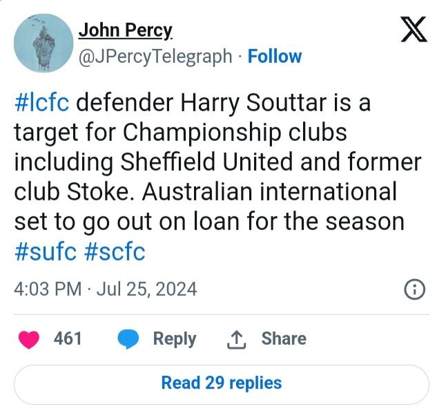 According to John Percy, as reported by Leicester Live, Leicester will allow Souttar to go out on loan for the 2024/25 campaign. A return to the Championship seems likely for the 25-year-old, with Sheffield United and Stoke expressing interest.