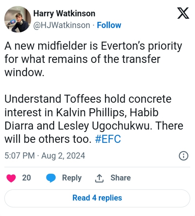 Everton is currently prioritizing the acquisition of a new midfielder and has shown concrete interest in three players: Kalvin Phillips, Habib Diarra, and Lesley Ugochukwu.