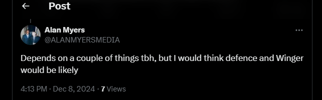 “Depends on a couple of things, to be honest, but I would think defence and winger would be likely,” he wrote.