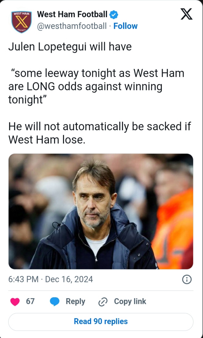 As reported by Whetstone via West Ham Football on X, “Julen Lopetegui will have ‘some leeway tonight as West Ham are LONG odds against winning tonight.’