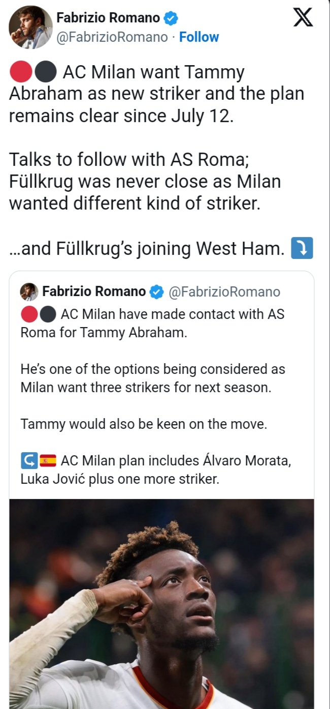 Although the club’s interest seemed to wane after securing Fullkrug, their failure to land Aston Villa’s Jhon Duran might prompt them to pursue Abraham to bolster their attacking depth.