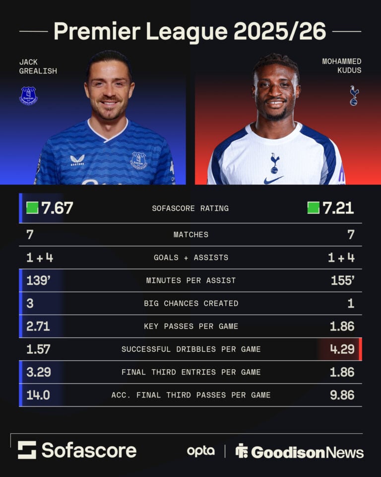 Jack Grealish’s impact at Everton has been nothing short of transformative, with the Toffees sitting eighth in the Premier League after seven matches.