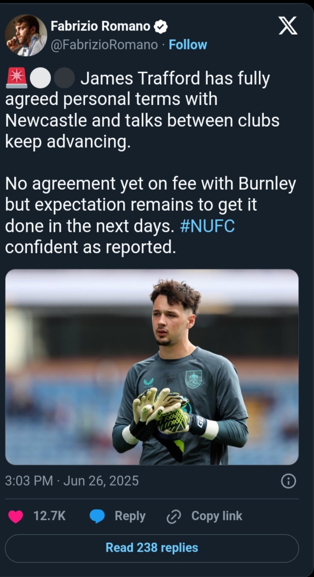 “⚪️⚫️ James Trafford has fully agreed personal terms with Newcastle and talks between clubs keep advancing.