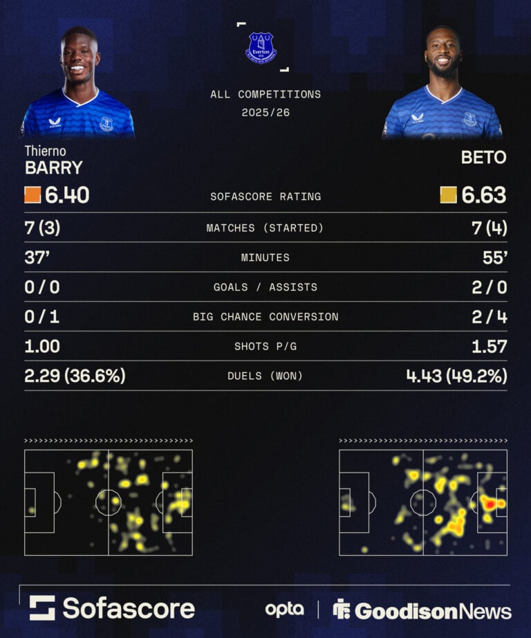 According to Sofascore, Barry has featured seven times without finding the net, while Beto has just two goals from the same number of appearances.